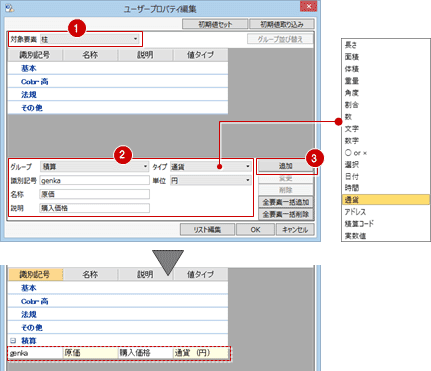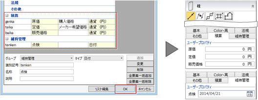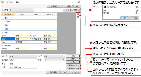 - 設定したユーザープロパティを他のモデルデータでも使用したい場合は、「初期値セット」「初期値取り込み」で書き込んだり、取り込むことができます。