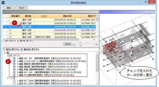 「更新履歴」を選びます。 - 更新履歴の各行をクリックすると、その更新時に追加・変更・削除されたオブジェクトが画面左下に一覧で表示されます。また、画面右側に立体で表示されます。