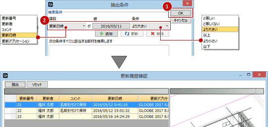 特定のオブジェクトに関する更新履歴のみを表示させたい場合などは、条件を指定して更新履歴を表示します。