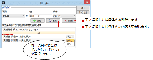 - 複数の検索条件を設定するときは、検索条件を設定して