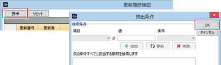 - 抽出結果から元の更新履歴一覧に戻すには、再度「更新履歴確認」ダイアログの「抽出」をクリックして、検索条件を設定せずに「OK」をクリックします。