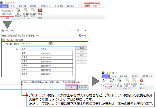 「プロジェクト」の「4D」タブが開きます。 - 「4Dシミュレーションを行う」をONにして、プロジェクト開始日とフェーズごとの日付を設定します。