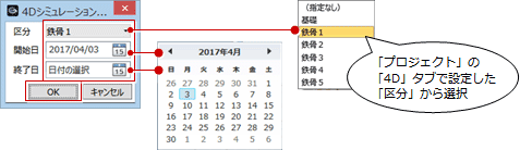 「プロジェクト」の「4D」タブで設定した区分から選択します。