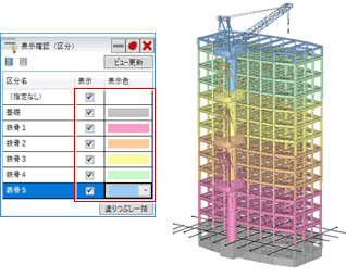 - 「表示確認」パネルを開いたまま、部材の選択や編集が可能です。プロパティの「区分」を変更した場合は、「ビュー更新」をクリックすると3Dビューに反映されます。