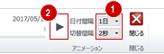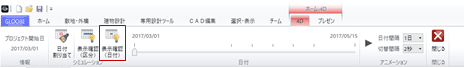 - リボンにある「日付間隔」と「切替間隔」を設定して「▶」をクリックすると、日付を自動送りして3Dビューでアニメーション表示が可能です。
