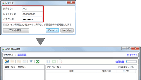 「ARCHIBox連携」を選びます。- ARCHI Boxの契約ID、ログインID、パスワードを入力して、「ログイン」をクリックします。