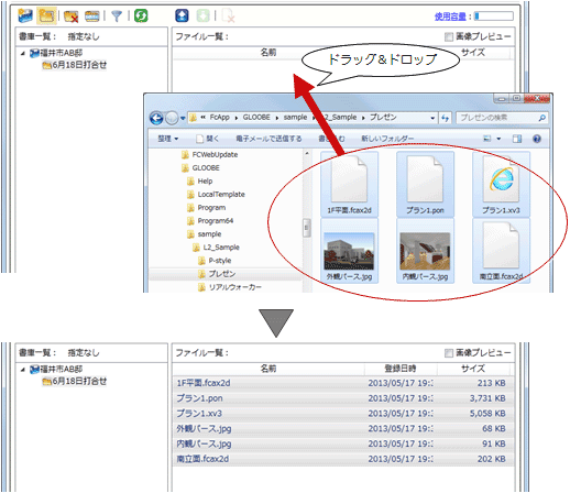 - エクスプローラから、アップロードするファイルをドラッグ&ドロップします。