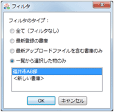 フィルタ | 条件を指定して、表示する書庫を絞り込みます。全表示に戻すには、再度クリックして「全て(フィルタなし)」を選びます。![]() |