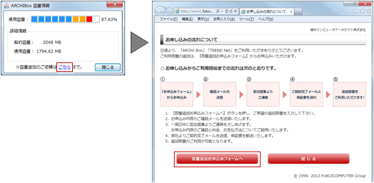 「※容量追加のご依頼はこちらまで」のリンクをクリックすると、容量追加の案内ページが開きます。