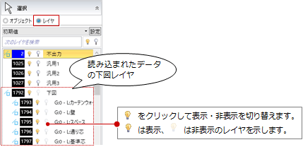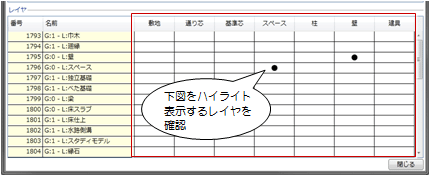 「2D BIM化アシスト」で配置した下図の場合は、「レイヤ」でハイライト表示するレイヤに変更がないかどうかを確認します。