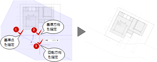 「下図回転」を選びます。 - 回転の基準点と基準方向をクリックします。