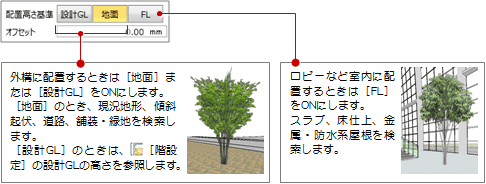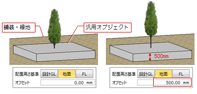 「ピッチ」については、「樹木をある間隔でまとめて配置するには」を参照してください。 - 検索対象外である汎用オブジェクトの上に樹木を配置したい場合は、「オフセット」に検索されたデータからの高さをセットします。次図の場合、「オフセット」に舗装・緑地からの高さ(この場合、500㎜)をセットします。