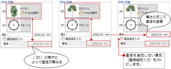 - 樹木の高さ、直径は、プロパティ「基本」タブのサイズで変更します。なお、直径と高さの比率は、「3D」の樹木ごとに設定されています。