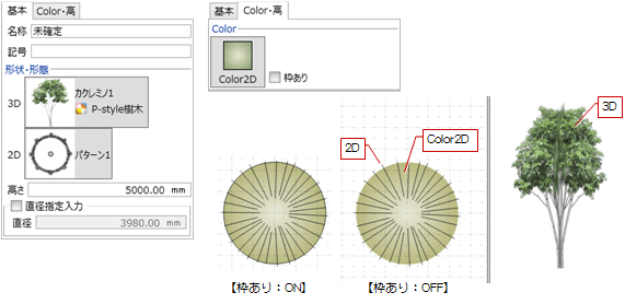 樹木の平面ビュー、3Dビューでの表現などは、プロパティ「基本」「Color・高」タブで設定します。