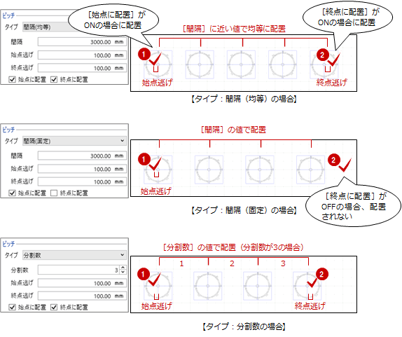 「線分連続配置」に変更します。 - ピッチのタイプ、間隔(分割数)、始点・終点逃げを設定します。