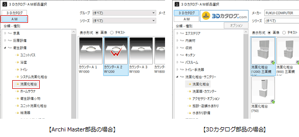 初めて使用する場合は、「3Dカタログ・AM部品選択」ダイアログが開きます。- 使用するマスタ(ここでは「AM」)を選びます。