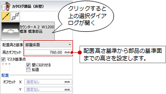 - 「高さオフセット」には、配置高さ基準から部品の基準面までの高さを設定します。