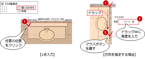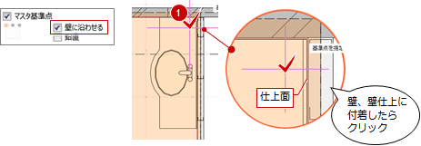 壁から離れた位置に1点配置したい場合 「壁に沿わせる」をOFFにして、任意の位置をクリックします。