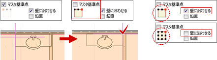 なお、「壁に沿わせる」のON/OFFによって指定できる基準点が異なります。