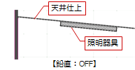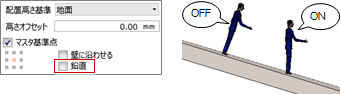 - 「鉛直」がOFFの場合、「配置高さ基準」が「地面」「部屋床面」「部品面」「天井面」「屋根面」のときに基準の勾配に合わせて部品が傾斜します。ONの場合は、傾斜に沿わず鉛直になります。