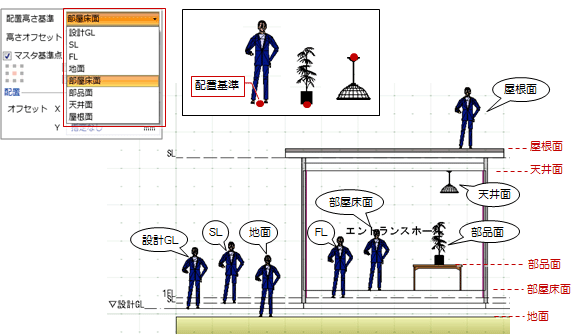 - 人物を地面に配置する場合は、「配置高さ基準」を「地面」に設定します。一方、内観に置きたい場合は「部屋床面」に変更します。