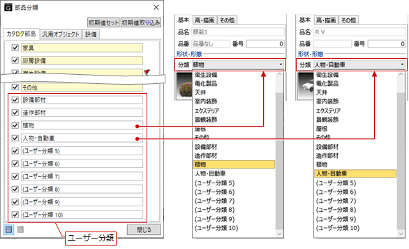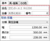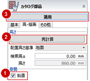 - 「配置高さ基準」やプロパティ「基本」タブの品名、分類、大きさは、カタログ部品で設定されているものがセットされます。サイズを変更して配置することも可能です。