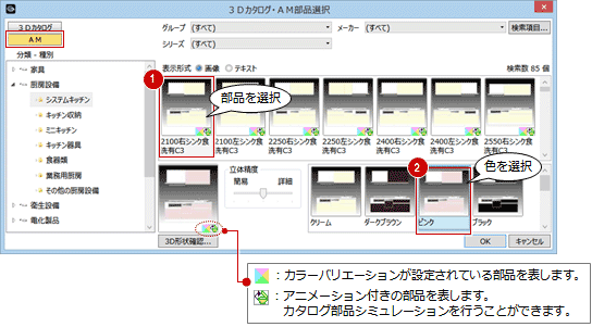 玄関収納やシステムキッチンなど、1つの部品に複数の色が登録されている部品は、「3Dカタログ・AM部品選択」ダイアログの一覧から部品を選択し、右下から色を選びます。