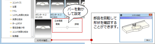 カタログ部品の丸みをなめらかに表現したいときは、「3Dカタログ・AM部品選択」ダイアログの「立体精度」を「詳細」側に設定します。