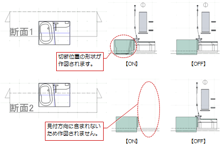 「立面を開く」において、断面線・立面線の位置でカットしたカタログ部品の形状を描画して、部品と躯体との正確な干渉などを確認したいときは、作図表現(3Dビュー他)の「切断線上の部品類をカットする」をONにします。OFFの場合は、見付方向を含んでカタログ部品の断面を描画します。