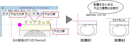 ただし、AM部品の平面表現とは別要素となります。そのため、AM部品を移動しても不出力要素は追従しません。なお、3DビューにてAM部品を配置した場合は、不出力要素は登録されません。