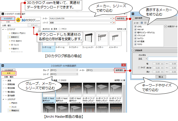 | 3Dカタログ | 3Dカタログマスタに登録されている部品を使用します。3Dカタログ.comを開いて、実建材データをダウンロードすることもできます。 また、ダウンロードした実建材のオプション変更もおこなえます。 |