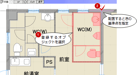 「ユニット登録」を選びます。 - 配置するときの基準になる点をクリックします。