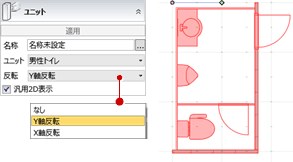 対象外 通り芯、基準芯、吹き抜け、用途区画、エレベータ、意匠目地、敷地境界・地盤、等高地形、傾斜起伏、道路・舗装・緑地、縁石、塀フェンス、水路側溝、水路側溝枡、擁壁、駐車ライン、スタディモデル、鳥かご、計算建物、断面線、立面線、展開視点、複数階にまたがっているオブジェクト - ユニット化したデータは、プロパティで反転や汎用2D表示の設定が可能です。