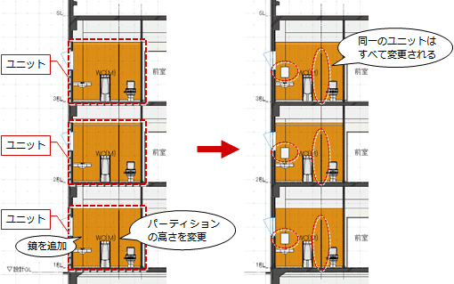 ユニット化したデータは、1つを編集すると他の同一ユニットも同時に変更されるので、効率的に編集を行うことができます。