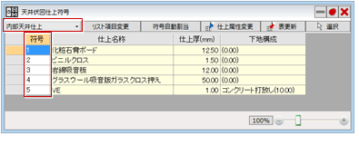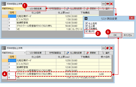 すでに「符号」が設定されていても、上から順に数字が割り付けなおされます。 - 受け材が異なる仕上に対して別の符号を割り当てるには、「リスト項目変更」で「受け材」をONにします。天井仕上のプロパティで受け材の名称が設定されているものが一覧に表示され、別の符号を設定することができます。