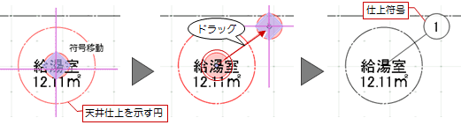 天井仕上を選択したときのハンドルが「◇符号移動」の状態でドラッグすると、仕上符号を任意の位置に移動でき、その情報を天井伏図の作図に反映できます。