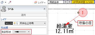 「1点指定」であることを確認します。 - 平面ビューで、符号を割り当てたい天井仕上をクリックします。