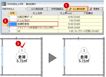 割り当てた符号を、別の天井仕上に割り当てることで天井仕上のプロパティを変更します。