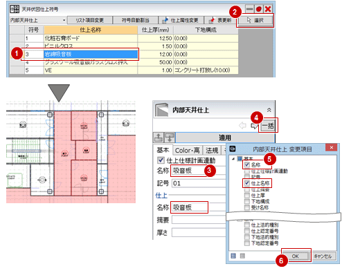 指定した符号の天井仕上のプロパティを一括変更して、表に反映します。
