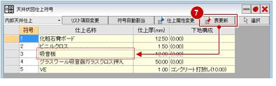 「表更新」で天井仕上の一覧を更新できます。 - 数字の符号を自動で割り付けるには、「符号自動割当」をクリックすると、上から順に数字が割り付けられます。