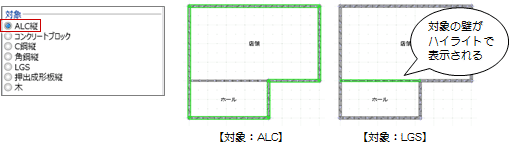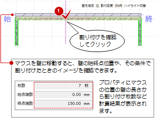 (割り付けタイプについては、「ALCなどの壁の割り付けを設定するには」を参照) - 割り付けを変更する壁を指定します。