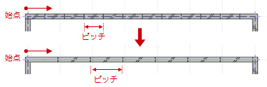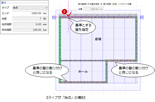 - Qキーを押すと、「割付」の「タイプ」が順に切り替わります(マウス指定⇒始点⇒終点⇒部材中央⇒目地中央⇒両方)。
