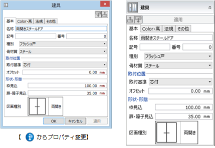 オブジェクトリスト、建具仕様において、選択したセルの部材のプロパティを変更します。