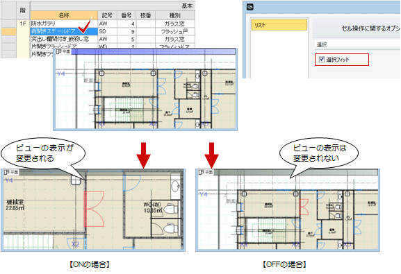 一方、ビュー内に建物全体を表示し、オブジェクトの位置を確認するような場合、「選択フィット」をOFFにします。セルをクリックしてもビューの表示状態は変更されません。