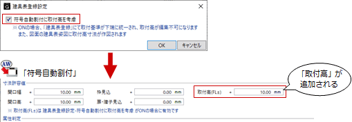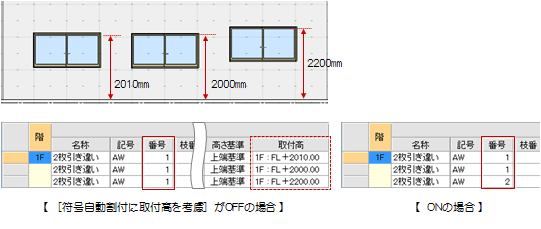 ONにすると、符号自動割付」の「寸法許容値」に「取付高(FL±)」が追加され、取付高が許容値以内だと同じ番号、許容値以上だと別番号になります。