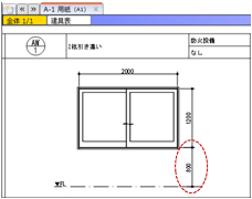 このとき、建具表登録」を実行すると、取付基準が下端に統一されて取付高が編集不可になります。また、図面・GLOOBEシートにて建具表を作成したときに、姿図に建具取付高が作図されます。