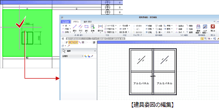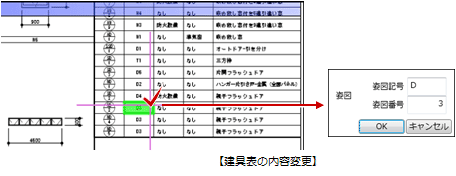 姿図ビューに表示されている建具表の姿図符号や形式、取付場所などの内容も編集できます。