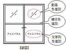 「建具表編集-姿図編集」ウィンドウが表示されます。 - 汎用コマンドを使用して、線分や文字列の追加など編集を行います。