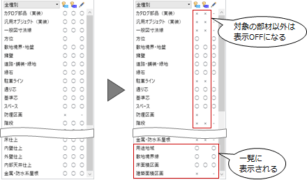 次の要素種別を2D/3Dとも表示ONにします。これら以外の要素種別は自動的に非表示になります。
