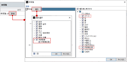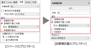 - 参照階から作成される床面積区画は、参照階設定の種別選択で「申請面積-床面積区画」のON/OFFによって異なります。